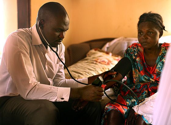 During a home care visit, Asifiwe Mumbere checks the blood pressure of 38-year-old Aisha Nabiyisha, a mother of seven who is living with HIV.
